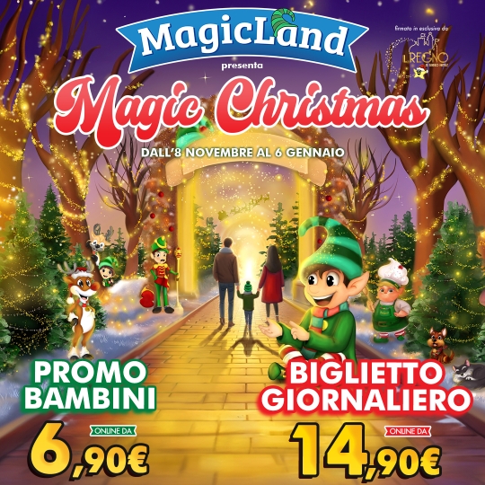 In occasione di Magic Christmas il biglietto di ingresso* a MagicLand per gli adulti avrà un prezzo ridotto a 14,90 euro online e 24,90 euro in cassa, mentre tutti i bambini pagheranno 6,90 euro online e 14,90 euro in cassa (dai 90 ai 140 cm di altezza; l’ingresso è gratuito sotto i 90 cm).